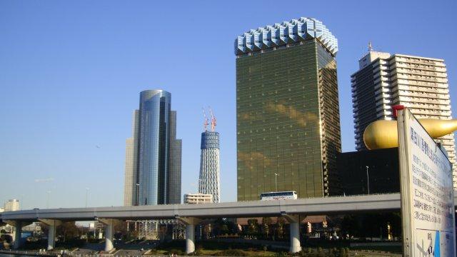 浅草駅から雷門に向かう道路は大変な人出です。歩道はもちろんのこと、車道まで通行止めにして参拝客が溢れています。通行止めというのは東京マラソン以外にはあり得えないことです。今日は人混みとは反対側の吾妻橋を渡ります。墨田区役所とアサヒビール本社ビルの間に、建設中の東京スカイツリーの塔が威容をはなっています。現在は254mまで組み上がっていますが、この2.5倍の高さになったら、どのように見えるのでしょうか?
