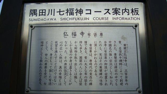 - ルート: 浅草駅→三囲神社(恵比寿神・大黒神)→弘福寺(布袋尊)→長命寺(辨財天)→向島百花園(福禄寿)→白髭神社(寿老神)→多聞寺(毘沙門天)→鐘ヶ淵駅