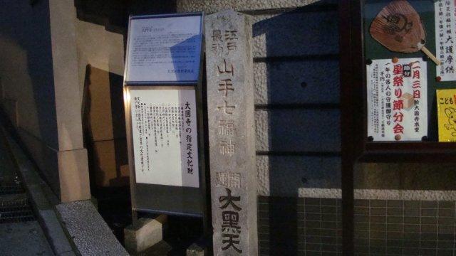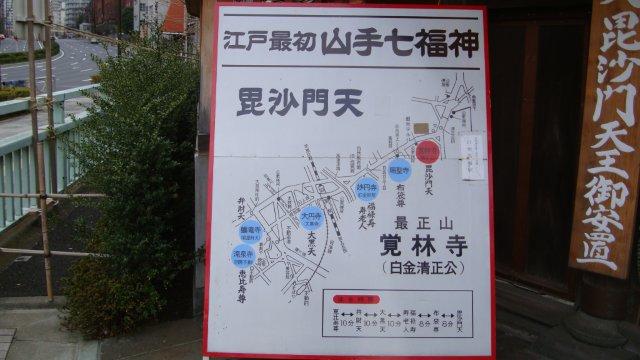 - ルート: 白金高輪駅→覚林寺(毘沙門天)→瑞聖寺(布袋尊)→妙圓寺(福禄寿・寿老人)→蟠竜寺(岩屋弁財天)→瀧泉寺(目黒不動)(恵比寿神)→大円寺(大黒天)→ 目黒駅