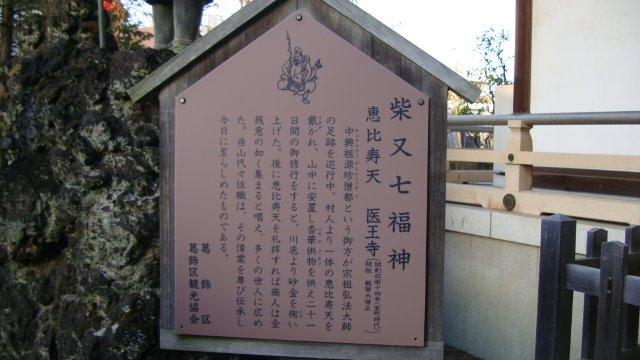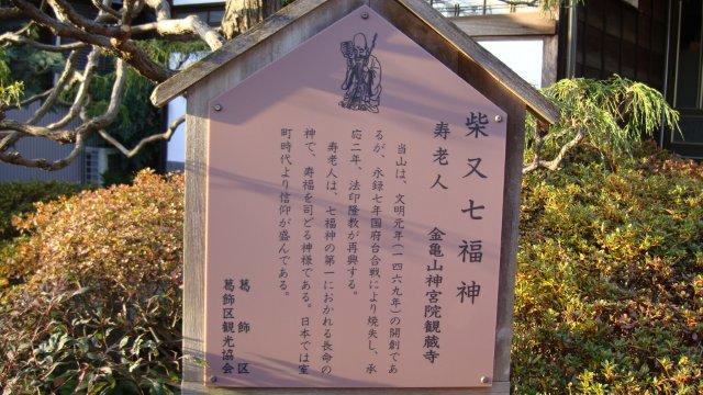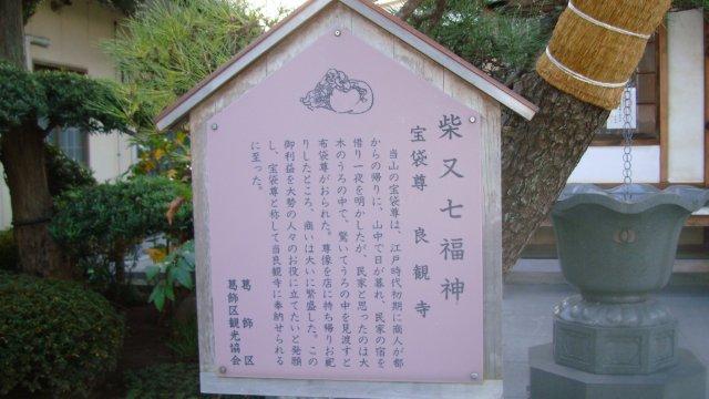 - ルート: 京成高砂駅→勧蔵寺(寿老人)→医王寺(恵比寿天)→宝生院(大黒天)→万福寺(福禄寿)→真勝院(弁財天)→良寛寺(宝袋尊)→題経寺(柴又帝釈天)(毘沙門天)→柴又駅