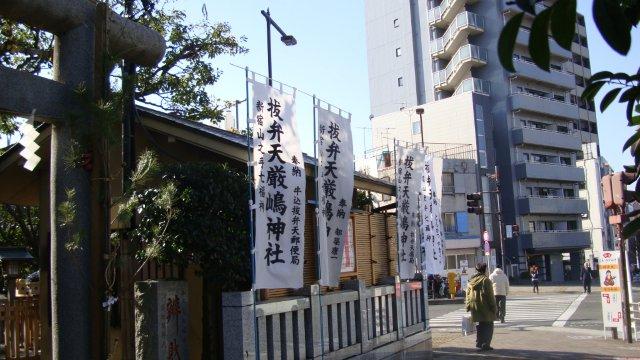 厳島神社は、通称抜弁天と呼ばれています。小さな神社で、通りから10mほど入ると反対側の道路に出てしまいます。簡単に通り抜けられることから、苦難を切り抜ける御利益があるとされています。モノは言いようですね。