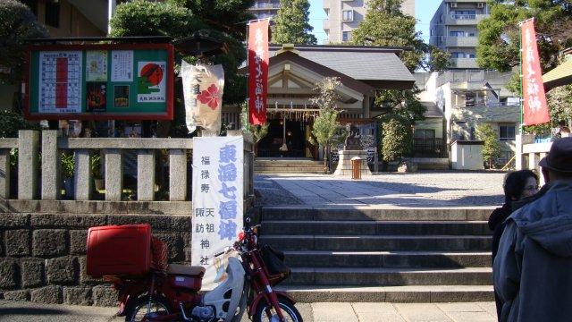 鈴ケ森刑場遺跡から第一京浜を離れ、ほぼ並行する旧東海道に入ります。天祖諏訪神社には福禄寿が祀ってあります。