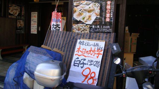 吉田屋の先にある「海鮮居酒屋 いさりび」は超激安の居酒屋さんです。本日の大赤字メニューは、白子ぽん酢で98円でした。そりゃぁ、赤字にもなるでしょう。刺し身の豪華盛り合わせは689円!一度入ってみたいものです。