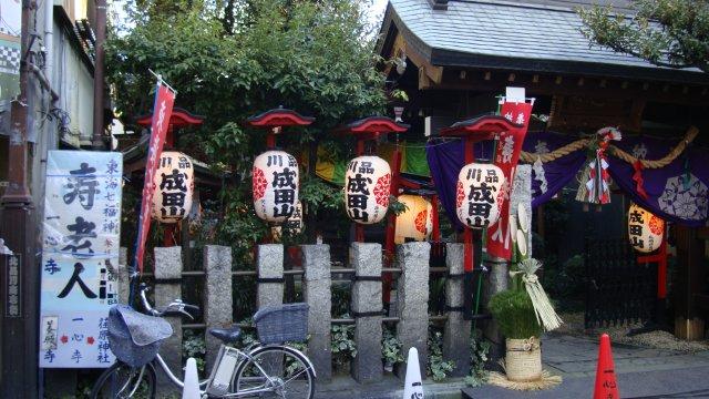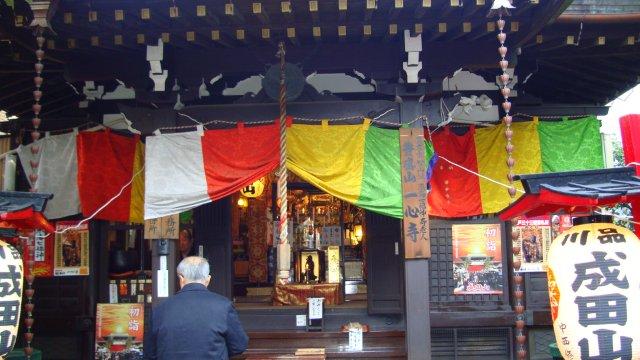 品川宿本陣跡など、旧東海道の史跡を眺めながら商店街を進みます。寿老人を祀る一心寺は商店街に溶け込むように佇んでいます。