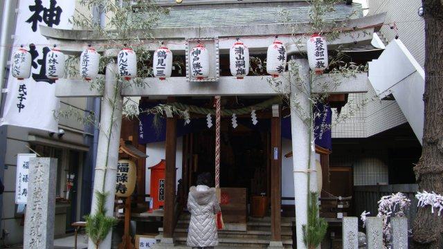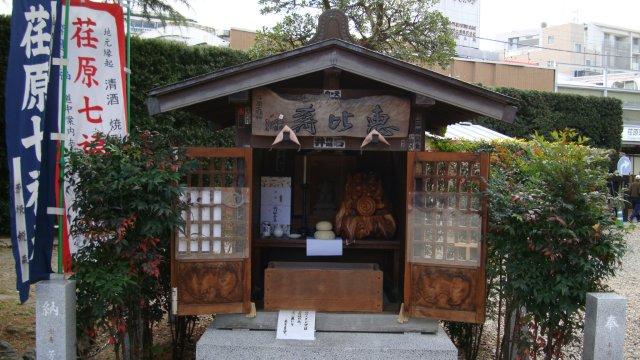 法蓮寺は東急大井町線の荏原町駅に隣接しています。恵比須様は入り口わきの堂に鎮座しておられます。