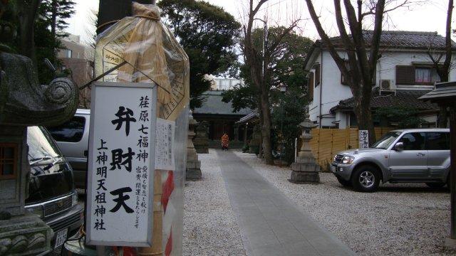 坂を上り下りし、進路を右に左に折れ、迷いながら上神明天祖神社に向かいます。再び三間通りに戻ったところに上神明天祖神社があります。「蛇窪の明神さま」と親しまれ、弁財天を祀ってあります。「蛇窪」とは何とも近づきがたい名前ですが、これはこの辺りの昔の地名だそうです。