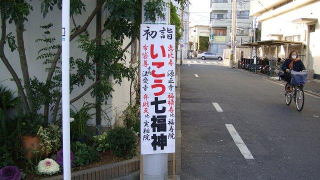 今日も寒い一日でした。ガイド本の七福神巡りコースを全部歩いたので、これからはネットで見つけた番外編を巡ることにします。昨年歩かなかった伊興七福神なんかコンパクトで面白そうですね。寺社の住所を印刷し、番地を頼りに歩きたいと思います。このコースにはお寺が全部で4つしかありません。実相院には大黒天・毘沙門天・弁財天が祀られ、福寿院には寿老人と福禄寿を祀っています。しかもこの2つのお寺は道路を挟んで向かい合わせにあります。数十メートル歩くだけで、七福神のうち5福神に参拝できるわけです。残る2つのお寺も番地が近いので近所にあるのでしょう。駅から歩いても30分もあれば全部回れるだろうと気楽に考えて竹ノ塚駅に降り立ちます。伊興七福神のコースマップはガイド本にないので、お散歩で持ち歩く東京23区の地図を使うことにします。ところが、伊興は足立区の北にあるため、周辺の地図の縮尺は2万分の1となっています。1万分の1の縮尺の地図と比べて、距離感が倍になるのと記載が荒くなるのとで、随分見づらくなります。それでも、実相院と福寿院は地図に載っています。竹ノ塚駅から真西の方角に1kmほど離れた場所です。源正寺は地図では見つかりませんが、番地的に福寿院の近くと推定されます。法受寺は実相院の隣の番地のようです。伊興は古い土地らしく、幹線道路を除けば曲がりくねった道路が複雑に絡んでいます。しかも、今の期間は町中に七福神のノボリが立っています。でも、このノボリを目印に歩くととんでもない方角に進んでしまいます。道順を示す矢印がないし、関係ないところにも立てられています。