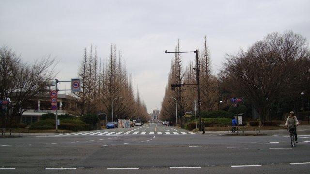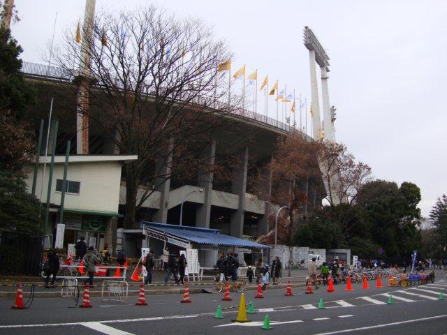 反転して神宮外苑のいちょう並木を進み、神宮球場・国立競技場の脇を抜けて仙寿院に向かいます。国立競技場に続く道路は、全国高校サッカー大会の決勝戦を観戦するサポーターで一杯です。
