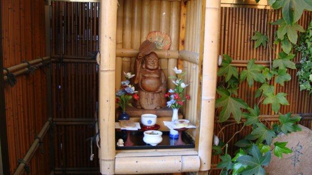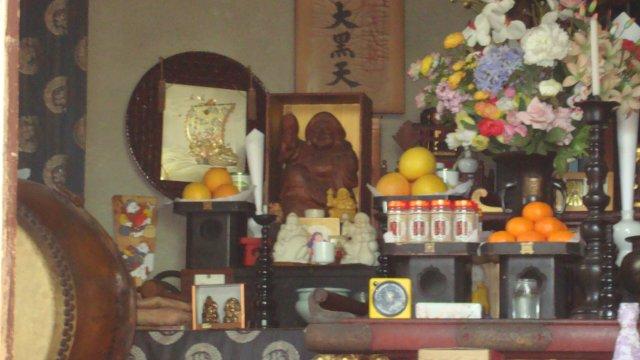 大黒天を祭ってある馬頭観音はお寺というよりも民家の雰囲気です。狭い階段を上がった先に小さな庭があり、そこから座敷のようなところに鎮座されている大黒天様を拝むわけです。