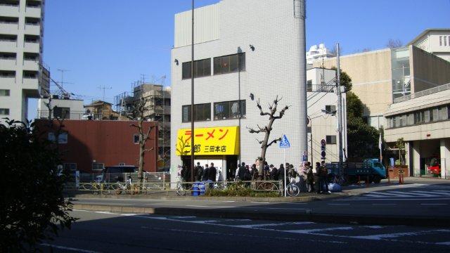 慶応義塾大学前バス停の先のラーメン二郎の前には相変わらず行列ができています。昼休み時ですが、午後の仕事に間に合うのでしょうか?