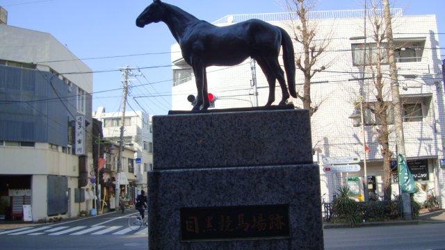 目黒通りの元競馬場前のバス停の先には、「目黒競馬場跡」の記念碑があります。GU重賞の目黒記念レースの由来となった競馬場ですが、戦前に廃止され、今は住宅街になっています。当時のコース外周部がそのまま路地になっているところがあるそうですが、見そこないました。肉まんの目黒五十番の方ばかり気をとられていたからでしょうか?