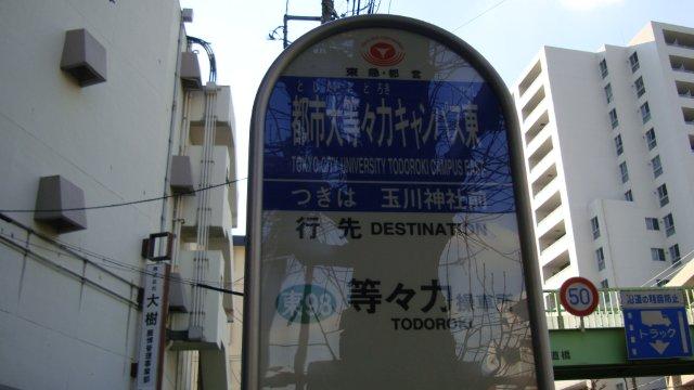 等々力七丁目停留所の次は「都市大等々力キャンパス東」となっています。馴染みのない大学名ですが、昨年武蔵工業大学と東横学園女子短期大学を統合して東京都市大学と改称されたそうです。ちょっと前に発行された地図本には「東横学園裏」という停留所名になっていますのでご注意。何故、「裏」が「東」に改称されたのかは不明です。