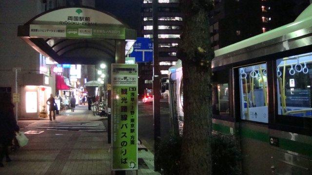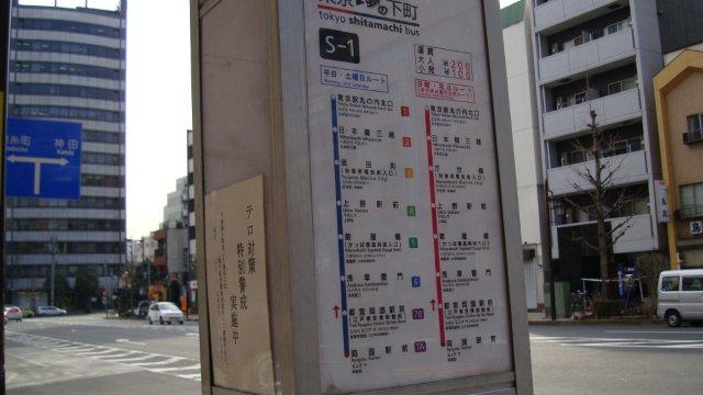 今日はランキング第五位である「S−1」路線を歩くことにします。路線番号が通常と違うのは、下町の観光ポイントだけに停車する、都営バス路線の中で唯一の観光路線だからです。恐らく、”S”は「Sightseeing」からきていると思われます。東京の中心である東京駅を起点にして、老舗デパートの日本橋三越、秋葉原の電気街、上野公園&アメ横の上野、かっぱ橋商店街、浅草雷門、大相撲の聖地である両国と、下町の主要観光名所を網羅しています。しかも、停留所がそれぞれ1ケ所に絞られていますので無駄な時間がかかりません。車体は斬新(でもないと思うのですが)なデザインで、車内には大きなディスプレイが2台備え付けられ、アナウンスは日本語は勿論のこと、英・中・韓の4ケ国語で行われます。といっても、乗っているのは東京見物の日本人か急ぎの常連客ばかりですが。。。「S−1」の起点は東京駅丸の内北口、終点は両国駅前となります。停留所の間隔が長いので、どの道を通るのかは地図からは判断できません。仕方がないので、最初にバスに乗って走るルートを確認することにします。