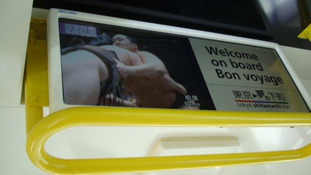 両国駅の西口からガードを抜けた国技館通りに起点のバス停がありました。S−1のバス停には、必ず「東京→夢の下町:観光路線バスのりば」の看板が立てられています。でも乗り場が多いところではなかなか見つけられません。バスがやってきました。窓は丸みを帯びて大きく、かつ境目が殆ど目立ちません。乗り込んでみますと、SUMOの文字と一緒に朝青龍の取り組みがディスプレイに映っていました。これからは白鵬に差し替えないといけませんね。