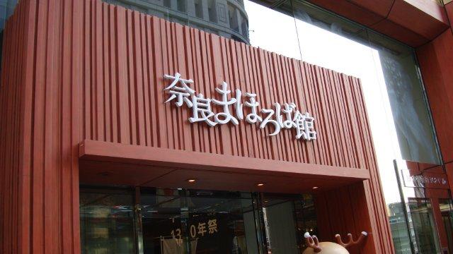 道路の反対側には各県の物産館が立ち並んでいます。「奈良まほろば館」の前にはせんとくんの像が立っています。鹿の角を生やして物議をかもしたキャラクターですが、頭がやけに大きいですね。2等身といってもいいくらいです。