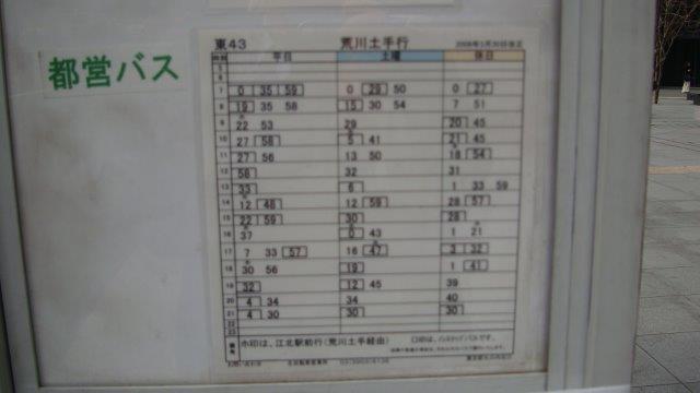 ついでに云いますと、神田橋のバス停は恐ろしく古風な標識になっています。元々の終点である「東43:荒川土手行」が堂々と表示してあり、付け足しで「江北駅行」の紙が貼り足してあります。バス停の維持にもお金がかかるんでしょうね。