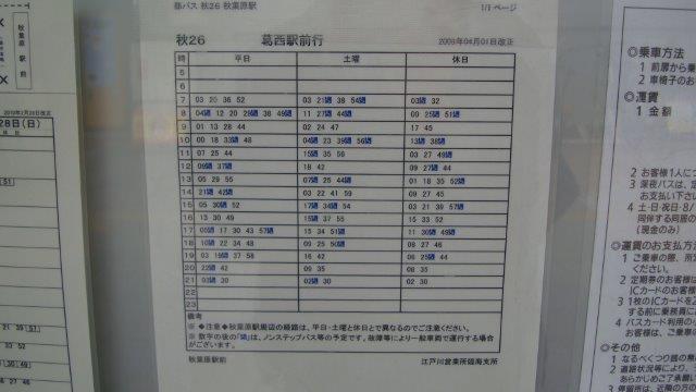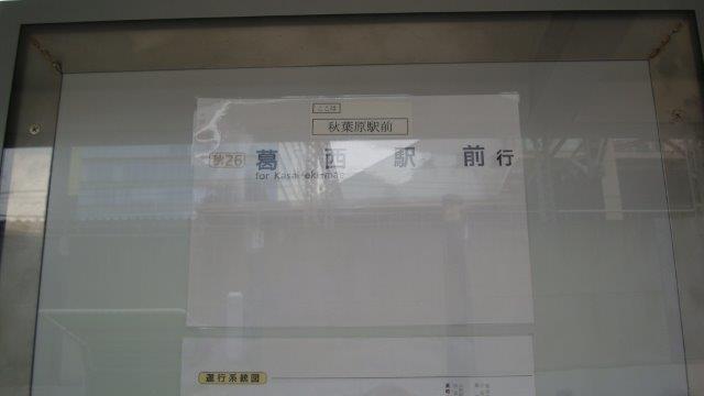 でも、どの方向に行くのでしょうか?時間を要しましたが、最終的にルートを特定できました。広場を出て、直ぐに左折しJRのガード下を進みます。中央通りを左折し、万世橋の方に向かいます。神田駅前バス停の先で左折し、岩本町三丁目交差点を左折し、岩本町交差点を右折して靖国通りに入ります。東神田交差点から清洲橋通りに入ります。後は旧葛西橋バス停までひたすら進めばいいのです。バス路線は鉄道と違って地図上は線で結ばれていません。そこを推理を働かせて経路を辿っていく面白さがあります。「秋26」は、秋葉原駅前広場から東神田バス停までのルートを見つけるのが一番のポイントです。但し、休日はアキバ歩行者天国の名残で、岩本町駅前までスキップしてしまいますのでご注意下さい。