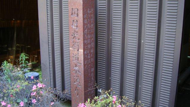 五街道とは、東海道・中山道 (中仙道とも表記)・甲州街道・奥州街道・日光街道ですが、奥州街道と日光街道は日本橋から栃木県宇都宮市までは共通となっています。どの街道も魅力がありますが、最初に日光街道を歩くことにします。私がお散歩の元祖と信じている芭蕉の足跡を少しでも辿りたいとの思いからです。芭蕉が「奥の細道」で実際に歩いたのは千住大橋から岐阜県の大垣市までですが、私の場合は日帰りで帰れるところまでにしようと思います。日光街道の起点が日本橋であることは周知の事実ですが、その先どのようなルートになっているのかが分かりません。昭和通りを北上すれば自然に日光街道に入るのですが、出来るだけ交通量の少ない旧日光街道を進むことにします。日本橋から三越本店の前を通り、日本橋三井タワー角の交差点を右折します。江戸通りのひとつ手前の、何ということもないビルの路地ですが、これが旧日光街道の本通りなのだそうです。昭和通りを地下道で渡った先にあるギンモントというホテルの植え込みに石碑が建っていますので間違いないでしょう。ところがこのホテル、4月末をもって廃業したのだそうです!あの石碑はどうなるのでしょうか?