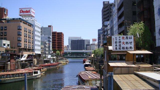 そのまま進みますと、衣料品の卸が建ち並ぶ横山町問屋街に入ります。京葉道路を越えた先で江戸通りと合流し、浅草橋に進みます。浅草橋の下を流れる神田川は、この先で隅田川に合流します。そのためか、両岸には何隻もの屋形船が係留されています。