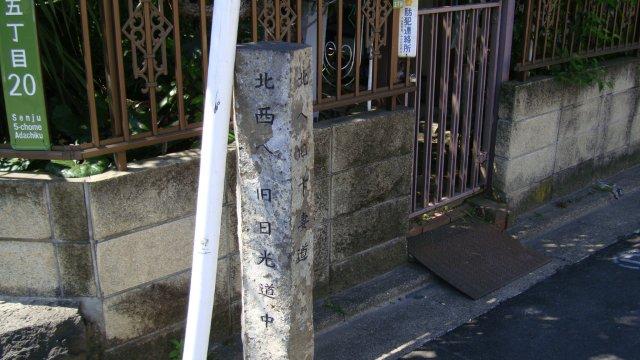 千住新橋を渡り、梅田五差路を北西に進みます。地図には、足立九中から先の道路に旧日光街道との表示があったのでそうかと思いましたが、実際は違っていました。足立九中前の三叉路にも石碑が建っていて、荒川土手下の川田橋交差点から真北に進むのが本来のルートのようです。ま、細かいことは気にしないで真っ直ぐに北上します。