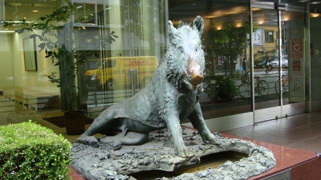 通りを歩いていましたら、見たことのある猪像を見つけました。ここはフィレンツェかと一瞬錯覚します。ピジョンという会社の玄関脇に置かれた「幸運を招く猪:ポルチェリーノ」はフィレンツェの猪広場にある像のレプリカとのことです。像全体は緑青に覆われていますが、鼻の頭だけはピカピカに輝いています。願い事をすれば叶うのでしょうか?でも、ジャンボ祈願をするのをまた忘れてしまいました。