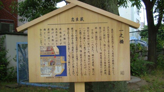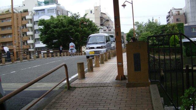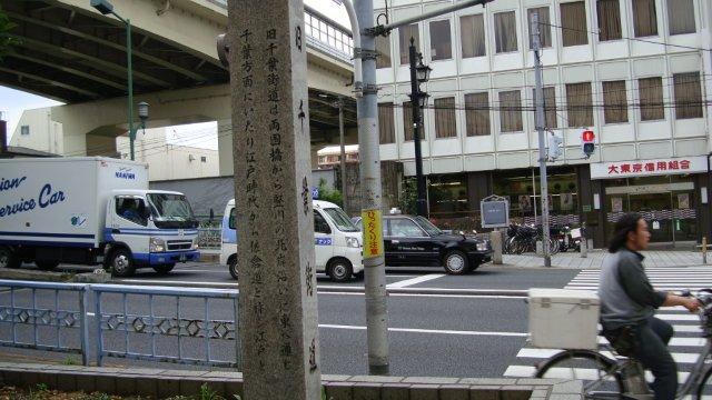 両国橋を渡り、京葉道路ではなく首都高7号(小松川線)の手前の道を進みます。これが今も残る旧千葉街道です。道幅は広いのですが、どういう訳か車は殆ど通りません。本所と呼ばれるこの辺りは低湿地だったため、江戸幕府は排水路を碁盤目状に開削し、掘りだした土で地盤を補強したのだそうです。首都高の下を流れる(一部埋められていますが)堅川も排水路のひとつで、隅田川から数えて一つ目の橋が一之橋となりました。本所には吉良上野介の屋敷があり、一之橋は赤穂浪士が吉良邸に討ち入り後、泉岳寺に引き揚げる際に最初に渡った橋だそうです。ということは、赤穂浪士が通ったのは千葉街道のほんの一部で、千葉街道を「通った」というよりは一之橋の手前で「横断した」というのが当たっているようです。
