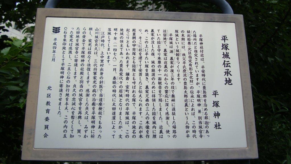 田端高台通りを進んで本郷通りに入ります。滝野川消防署の手前に、平塚神社の長い参道が奥に延びています。この場所には豊島郡衙が置かれていたとされていますが、その後、平塚城という城館が造られ、八幡太郎の通称で知られる源義家も奥州への遠征の帰路に城に逗留したことがあるそうです。義家は城主の饗応への感謝のために鎧と十一面観音を下賜し、城主はこれを埋めて塚となし城の鎮守にしたのだそうです。塚が平らだったので平塚という地名になったそうですが、ホントかなぁ?公園内を探しましたが、案内板以外に豊島郡衙の存在を伺わせる遺跡が残っていませんでした。