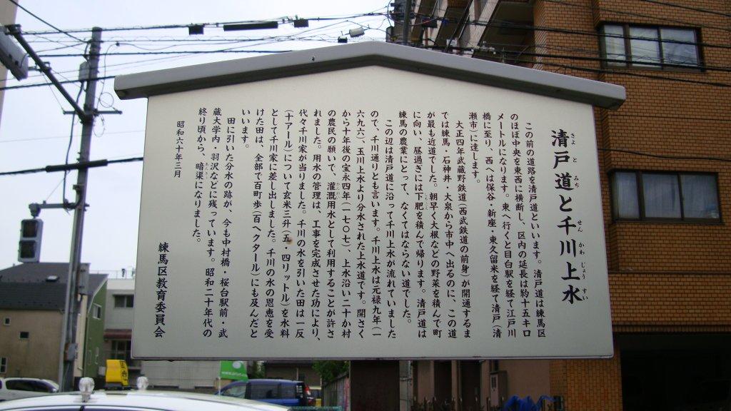 江古田駅先の踏切を渡って千川通りに入ります。この辺りの千川通りは別名「清戸道」とも呼ばれ、朝は練馬名物の大根とか野菜を積んだ荷車が市中に向かい、昼過ぎには下肥を積んで戻ったそうです。この道に沿って千川上水が流れていたことから千川通りと呼ばれるようになったとのことです。ちなみに、「千川」の由来は上水の管理を行った千川家に因んでいるとか。