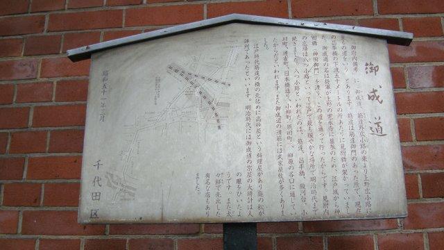 中山道は、日本橋から高崎までが国道17号線と同じルートになっています。高崎まではとても歩けませんので、国道17号線を目印にします。日本橋から中央通りを真っすぐに進み、JR神田駅のガード下を通って、靖国通りと交差する須田町交差点に出ます。国道17号線はここからやや右に向きを変えて万世橋を渡るのですが、私が参考にした地図ではそのまま直進して昌平橋を渡ります。こちらの方が自然ですが、理由が分かりませんでした。実際に歩いてみますと、「御成道」と書かれた古ぼけた案内板がありました。将軍が日光東照宮を参拝する際に使ったという日光御成街道の証か!と思ってよくよく読みましたら、東照宮ではなく上野の寛永寺に墓参に行く際に利用した道なのだそうです。残念ながら、中山道とのつながりは触れられていませんでした。