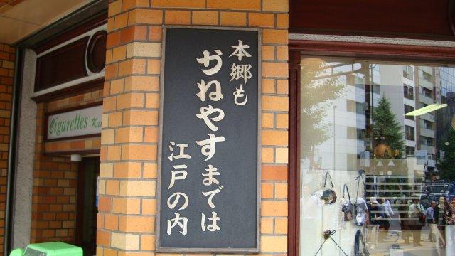 神田明神の参道入口を通って、湯島から本郷に進みます。「本郷もかねやすまでは江戸の内」でお馴染みの「かねやす」は元々は歯磨きを売っていたそうですが、現在は雑貨店になっています。享保15年に江戸で大火があり、防災上の観点から、町奉行大岡越前守は江戸城から本郷三丁目にかけての家は塗屋・土蔵造りを奨励し、屋根は茅葺を禁じて瓦で葺くことを許しました。このため、江戸の町並みは本郷まで茅葺が続き、それからの中山道は板や茅葺の家が続いたそうです。その境目に位置して、大きな土蔵のあった「かねやす」は特に目立っていたことから、古川柳に歌われたとのことです。