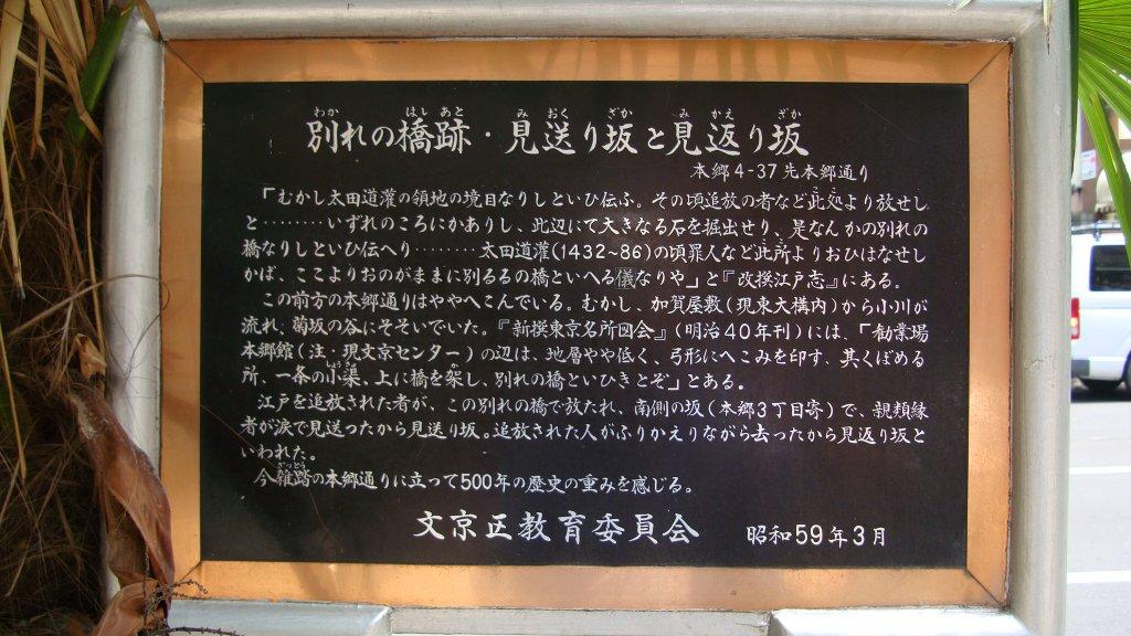 ここはその昔は太田道灌の領地の境でもあり、小川の流れる窪地でもありました。領地を追放となった罪人は小川に架けられた橋の上で放たれ、親類縁者は南側の坂から涙で見送り、追放された罪人は振り返りながら去ったということで、別れの橋と見送り坂・見返り坂とも呼ばれていたそうです。小塚原刑場と鈴ヶ森刑場の手前には泪橋があり、今生の別れに涙したとのことですが、生死は別にして別れの悲しみには変わりありませんね。