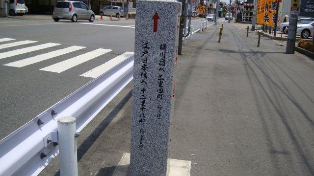 鴻巣市の加美二丁目というところで、二股の交差点の斜め左に進みます。石柱の標識があり、「熊谷宿へ三里三十二町、京三条大橋へ百二十三里六町」と書いてありました。ちょうど12時ですので、今日は熊谷宿を目指したいですね。ちなみに、ここは日本橋から十二里十八町の距離ですから、50km弱歩いたことになります。