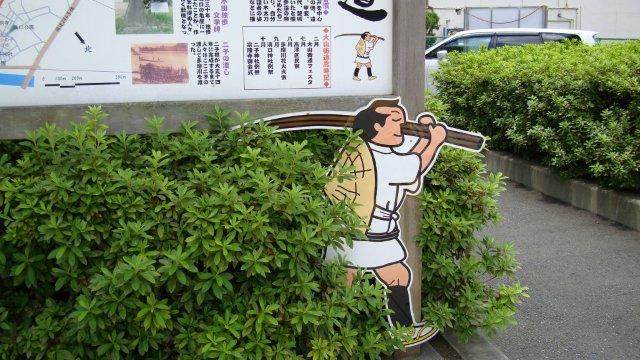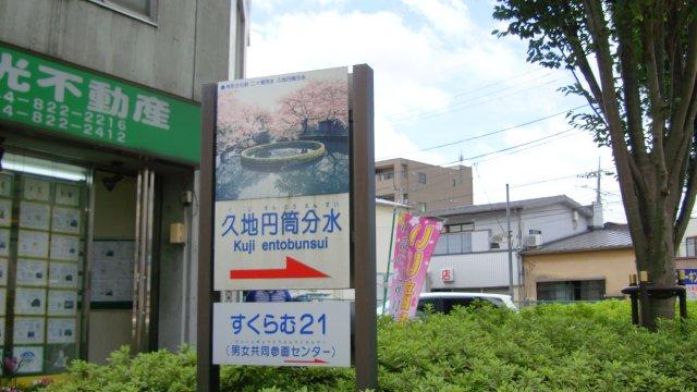 南部沿線道路と交差する栄橋交差点の角に、「久地円筒分水」という史跡があります。「円筒分水」とは、円筒状の設備の中心部に農業用水などを湧き出させ、一定の割合で水を正確に分配するために用いられた利水施設のことです。現在は緑地となっていますが、当時の写真でその様子が偲ばれます。敷地の中には大山街道の案内板もあり、街道の歴史などが解説されています。大山街道の多くの標識には、長い太刀を担いだ参詣者の姿が描かれています。これは「納太刀」と呼ばれるもので、参詣の際に自分の背丈よりも長い木太刀を奉納する習慣があったためだそうです。宅急便がない時代の歩きの旅ですから、さぞやお荷物になったことでしょう。