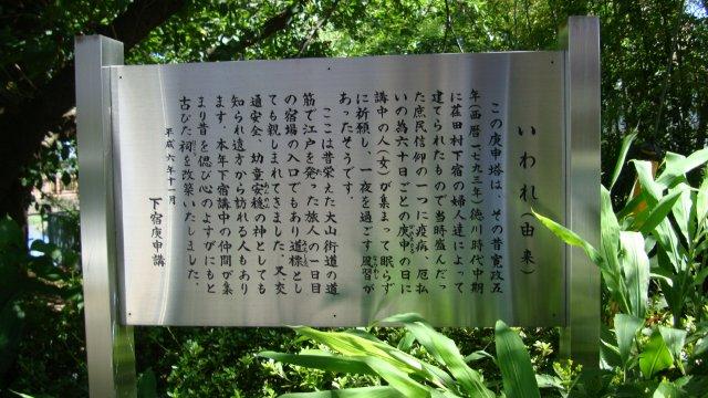 早淵川を鍛冶橋で渡った先の曲がり角に古ぼけた庚申塔が建っています。昔、この地区の婦人たちが庚申の日に集まって眠らずに祈願し、一夜を過ごす習わしがあったのだとか。庚申信仰は各地にあったのですね。
