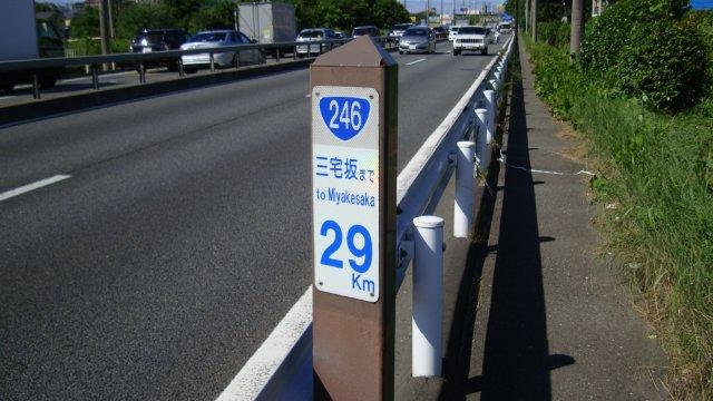 梅雨が明けた途端に猛暑が始まりました。今日は快晴で、夏の日差しが朝から強烈に降り注いでいます。久しく見なかった富士山ですが、いつの間にか山肌の雪は消え、真っ青な空に褐色の地肌がむき出しになっています。夕立の心配はなさそうですので、大山道の続きを歩くことにします。先日の中断地点である青葉台駅前に降り立ちますと、日曜日の早朝ということもあって駅前の道路は閑散としています。駅前から青葉台交差点まで進み、右折して西に向かいます。私の地図では、もえぎ野公園手前までは大山街道の表示がありましたが、そこから先のルートが判然としません。道なりに歩いて青葉台駅まで来たのですが、本当はもえぎ野公園交差点から国道246号線に出るのが正解なようです。青葉台交差点から緩やかな弧を描くようにして、こどもの国通りに突き当たる下恩田まで進みます。歩道がよく整備されていますので、とても歩きやすいですね。下恩田で国道246号線に入ります。2車線の道路は車が数珠つなぎになっています。皆さん、行楽地に向かっているのでしょうか?排気ガスを浴びながら狭い歩道を歩いてみますと、三宅坂まで29kmの標識が立っています。