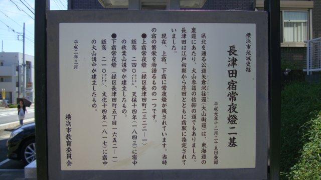 JR横浜線の高架手前の片町交差点で、国道246号線から離れて斜め右方向に進みます。最近整備されたのか、真新しくてきれいな道路です。ふと見ますと、カラータイルが敷き詰められた広い歩道の一画に、小さなお堂と古ぼけた石碑が並んでいます。石灯籠とお地蔵様もありますね。近づいてみますと、「長津田宿常夜燈二基−下宿」と書かれた木柱が立っていました。案内板には、「(神奈川県の)県北を通る公道矢倉沢往環[大山街道]は大山参詣の道で、長津田は江戸初期から荏田とともに宿駅に指定されていました。現在、上宿と下宿に常夜燈が残され・・・」と書かれています。道路の整備に併せて、当時の庚申塔とか道祖神とか道標と共に下宿の常夜燈を移築したのだそうです。大山道の史跡はあちこちで大事に保存されているのが見て取れます。