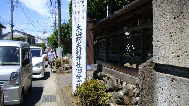 国道246号線を横断した先の境川を渡って大和市に入ります。観音寺前の交差点を左折し、細い裏道に入ります。日差しはいよいよ強くなり、暑さが堪えます。たまらずコンビニに入り、定番となったガリガリ君を買い求めます。ふと冷凍棚を見ますと、ペットボトルが並んでいます。最近はペットボトルのまま凍らせたジュースが売られているんですね。ついでに買い求めます。今日のような酷暑の日には冷凍のペットボトルは喉を潤すと共に体温を下げてくれますので重宝なのですが、溶ける速さが喉の乾きに追いつけません。結局はジュースと併用することになります。それはそれとして、この道路は道幅が狭い上に歩道がなく、しかも車が多くてとても歩きにくいですね。暫く進みますと、右手に「大山阿夫利神社分霊社」があります。道路の脇には、「是より東 江戸十里、是より西 大山七里」の道標が置かれています。大山街道の案内板でもあるかなと思って境内に入ってみましたが、新田義貞に縁のある神社らしく、鎌倉進撃の解説ばかりで大山街道の案内はどこにもありませんでした。