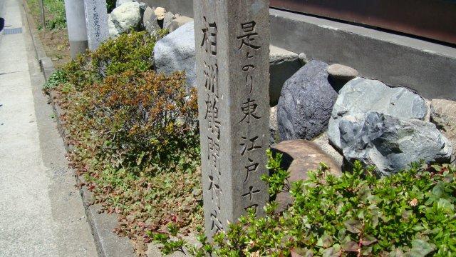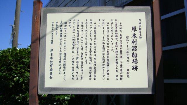 海老名駅から陸橋で小田急線を越え、あゆみ橋で相模川を渡ります。この辺りは水がきれいなようで、河原は家族連れで一杯です。子供たちは水遊び、大人たちはバーベキューで盛り上がっています。上流に少し戻ったところに「厚木村渡船場跡」の案内板が立っています。矢倉沢往環だけでなく、藤沢道や八王子道の旅人も利用したと書かれています。厚木はこれらの街道が交差した場所にあったために厚木宿と呼ばれ、江戸にも劣らぬ賑わいを見せていたのだそうです。