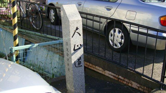 町田市辻交差点で左斜めの道路に入り、旧道を進みます。再び国道246号線と交差する目黒交差点角に、「五貫目道祖神」の石柱があります。石柱の表面は剥げ落ちて読み取れませんが、台座には「右 大山道」の文字が見て取れます。