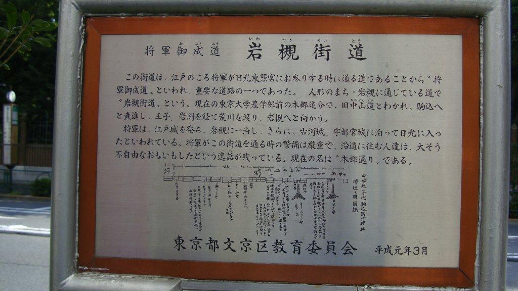 小川町交差点を右折し、須田町交差点を左折すると中山道に合流します。現在は神田川を昌平橋で渡りますが、昔は50m程下流に架けられていた見附橋を渡ったのだそうです。本郷追分で旧中山道と分かれます。ここには江戸時代に一里塚が置かれたそうですが、今はその痕跡すら残っていません。二股路を右に進みますと、道路脇に「将軍御成道 岩槻街道」の案内板が立っています。将軍は江戸城を発って岩槻城に一泊し、古河城・宇都宮城に泊まって日光に入ったそうです。大手門から岩槻城まで35km程ですから、一日で歩くには相当な距離です。昔の人は健脚だったんですねぇ。