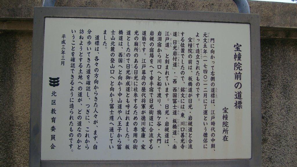 現在の本郷通りは飛鳥山の前を真っすぐに通っていますが、御成街道のルートは王子駅をぐるっと回り込むように迂回していました。音無川(石神井川の別名)を渡るためでしょうか?十条富士塚を過ぎ、環七を歩道橋で渡って清水坂を下ります。赤羽駅の高架下を通って、直ぐに高架沿いに進みます。突き当たりのT字路に寶幢院というお寺があります。門前に江戸時代中期に造立された古めかしい道標があり、「東 川口善光寺道・日光岩付(槻?)道 西 西国冨士道・板橋道 南 江戸道」とあります。