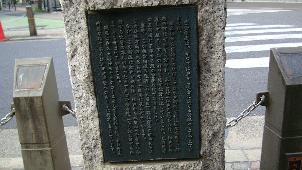 佐倉街道には、葛飾区新宿(にいじゅく)と佐倉を結ぶ「水戸佐倉道」、寒川湊(現在の千葉港)と佐倉を結ぶ「千葉佐倉道」の2つのルートが存在します。通常、佐倉街道といえば「水戸佐倉道」を指します。江戸時代初期、徳川譜代の土井利勝が佐倉藩主となってから江戸と佐倉間の街道が整備され、参勤交代にも利用される程の重要な道となりました(ちなみに、武家諸法度に参勤交代を組み込んだのは土井利勝です)。当時、佐倉藩をはじめ房総方面の大名あわせて十数藩が佐倉街道を往還したと云われています。佐倉街道の起点は水戸街道から分岐する新宿追分とされていますが、広義に解釈した場合には、水戸佐倉道が日光街道から分岐する千住とも云えます。あるいは、日光街道と水戸街道の起点である日本橋とする考え方もあります。それぞれによって距離は違いますが、新宿追分から佐倉までであれば約36km、千住から佐倉までであれば約42km、日本橋から佐倉までであれば約51kmの距離となります。宿場は、市川宿・八幡宿・船橋宿・大和田宿の4ケ所に置かれました(佐倉市の臼井宿を除く)。文化年間(1804年〜)の頃から佐倉街道を経由して成田山新勝寺へ向かう成田参詣が隆盛するに従い、佐倉街道は「成田道」あるいは「成田街道」という愛称で呼ばれるようになりました。佐倉から成田までは約16kmありますので、新宿追分から成田までは約52kmとなります。通常、佐倉街道は成田街道の一部として扱われることが多いようです。