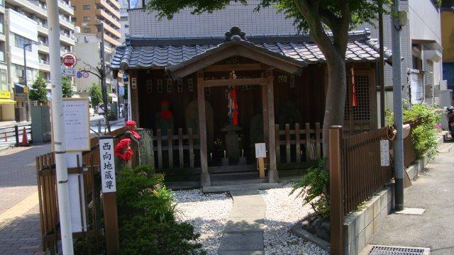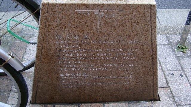 船橋の市街に入りますと、「西向地蔵尊」を祭ったお堂があります。船橋市最古の石造地藏菩薩像など何体かの地蔵尊像がありますが、昔この一帯は罪人の刑場だったそうで、当時流行した疫病がこれより先に広がらないようと、村人が西側へ向けた地蔵尊にお願いをしたものだと言われているそうです。ちなみに、この辺りが船橋宿の入口だったとされています。道路脇の案内板に東金街道の由緒が書かれていました。徳川家康が東金の鷹狩に行く際、家康の意を受けた佐倉城主の土井利勝が街道沿いの96の村々に分担させて1ケ月足らずの突貫工事で完成させたために、「一夜街道」とか「御成街道」とも呼ばれたそうです。家康の権力の強大さを象徴する逸話ですね。