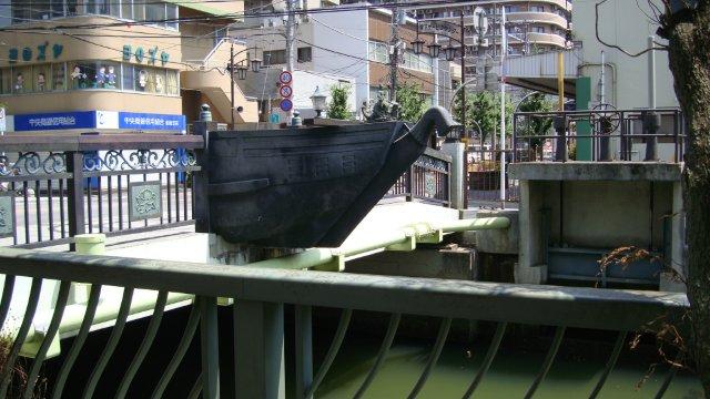 駅前通りの先に、船橋の地名の語源となった海老川があります。昔、東征に赴いた軍勢が川を渡れなかった時に、地元の人々が小舟を並べて橋の代わりにしたのだそうです。橋の真ん中には、舟の舳と騎馬の像が再現されています。現在の海老川は小さな都市河川ですが、当時はそれなりの川幅があったのでしょう。