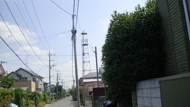 坂を上り、住宅地の中を進みますとT字路に突き当たります。正面に古い道標があり、「西 さくば道 右 成田ミち 左 江戸みち」と書いてあります(あるそうです)。1806年建立とのことですが、こんな住宅地によく保存してあったものです。右折して少し進みますと、地区の消防団の建物の横に火の見櫓が建っています。4−5メートルの高さの鉄塔ですが、周囲に高い建物がないので結構目立ちます。