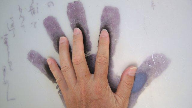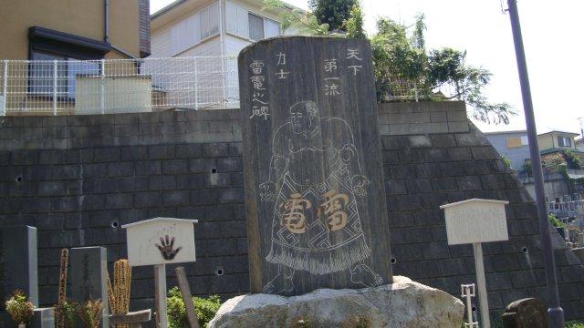 そのすぐ先に「雷電の碑」の案内板が立っています。右手の坂を下ったところに妙覚寺というお寺があり、境内には史上最強の名大関(当時は大関が最高位でした)と呼ばれた雷電為右衛門の巨大な顕彰碑があります。石碑には等身大の雷電の土俵姿が描かれていますが、相当の大男だったようです。横には手形を写し取った案内板があり、雷電の手形と自分の手形を重ねて大きさを比較することができます。身長1m97cm、体重168kgといいますから、手も大きかった筈です。試してみた人が多かったのか、私の手と同じ大きさの部分が黒光りしていました。