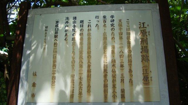 線路沿いに進み、黄色くなりかけた田んぼを眺めながら緩やかな坂を上って行きます。やがて両側には木々が生い茂り、森の中を歩くような気分です。なんだか薄気味悪いですね。聖隷病院入口交差点手前の公園に「江原刑場跡」の案内板と供養塔が建っています。ここは旧佐倉藩の刑場があったところで、1843年に藩医の鏑木仙安が蘭医学研究のために佐倉藩で初めて刑死者の人身解剖を行ったとのことです。近くに首洗井戸が残っているとのことですが、見つかりませんでした。