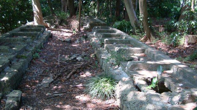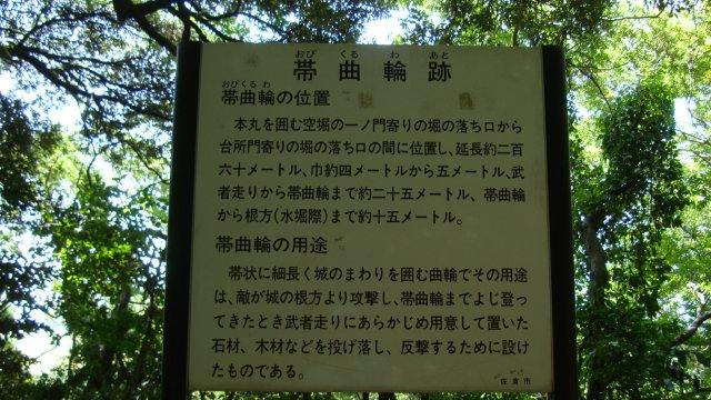 狭い道路と車の多さに閉口しながら20分ほど歩きますと、目の前に緑に覆われた小山が広がっています。目指す佐倉城跡公園です。鹿島川を渡って直ぐに右折し、川沿いに進んだ後で佐倉城址公園に入ります。門を抜け、木柱を埋め込んだ階段を上っていきますと、「帯曲輪跡」の案内板があります。敵が城の根方からよじ登ってきた際に、ここから石などを投げ落として防御するためなのだとか。実際に使われることはなかったのでしょうけど、かなり原始的な戦法ですな。