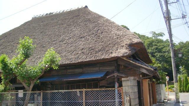 時刻はお昼過ぎです。猛烈な暑さなのでお散歩を中断してこのまま帰ってもいいのですが、折角ですから引き続いて成田街道を歩くことにします。公園を出た先で住宅地の細い道路に入り、海隣寺という坂を上ります。キツイ上り坂ですが、実際に居住している藁ぶきの民家などもあって昔の街道の趣があります。