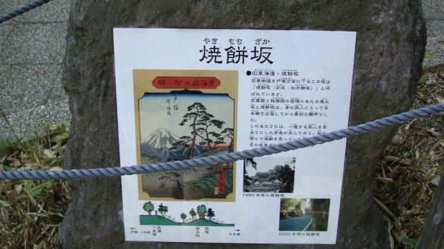 保土ヶ谷二丁目交差点から旧道に入ります。保土ヶ谷区内では、道路の分岐点毎に「歴史の道」と書かれた案内板があり、ルートに迷うことがありません。史跡の距離も添えられていますのでとても便利です。地理に不案内な人間には有難いですね。元町橋先からきつい登り坂の権太坂が始まります。江戸から西に向かう旅人が初めて出会う東海道の難所だったそうです。坂の名前の由来は、旅人が耳の遠い老人に坂の名前を訊いたところ、老人は自分の名前を訊かれたと思い「権太」と答えたことによるのだとか。坂道を切り開いた「権左衛門」という人の名前をとって「権左坂」と名付けたものが「権太坂」に変化したという説もあります。当時は今より勾配がきつかったそうですが、高台からの景色が良かったために、北斎の冨嶽三十六景にも描かれています。権太坂を上った先に「境木立場跡」の史跡があります。「立場」とは、宿場と宿場の間に設けられた馬子や人足が休息するところです。この先、焼餅坂と品濃坂という難所が続くなか、西に富士、東に江戸湾を望む景観が素晴らしかったことから、旅人が必ず足を止める名所だったそうです。ここは武蔵国と相模国の境界に当たり、その印しとして建てられた「境杭」という木柱が「境木」の地名の由来になったのだそうです。
